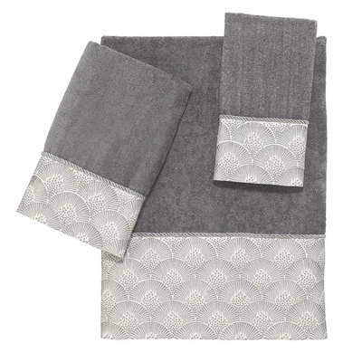 The Avanti Deco Shell Ivory 3-Piece Decorative Towel Set features a beautifully embroidered contemporary shell motif on a tonal ivory fabric border with coordinating rope trim, attached to a 100% cotton (exclusive of embellishment)ivory velour towel. Set includes one each of bath, hand and fingertip towel. Sewn in the US, imported materials.
