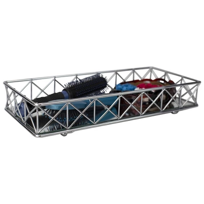 Bring order and elegance with this vanity tray. This versatile tray is the perfect decorative and aesthetic element to welcome in every room of your home, including the bathroom. it is perfectly suited to perch on your bathroom vanity, set on a table, or go atop your dresser. The open metal frame with the high clarity mirrored bottom all combine together to make a strikingly elegant vignette. Fill it up with your everyday essentials, such as your favorite fragrances, glosses, nail polish, hair brush, and wristlet. Or group together with loose mail and keys to keep clutter from taking over on the countertop. Other than holding items, it is a great serving tray for sliced bread and small appetizers for guests. Keep one handy for yourself or gift to friends and family. Item dimensions may differ slightly due to the unique nature of the product. Color and finish may differ slightly from the images shown due to differences in monitor displays. Props and accessories are not included.