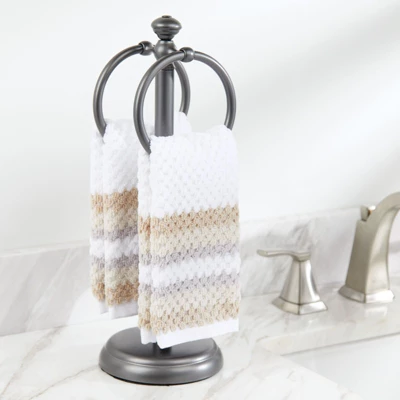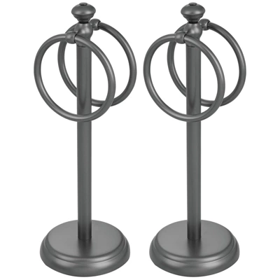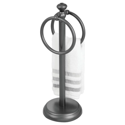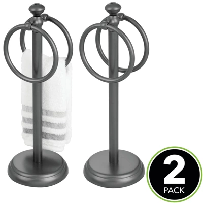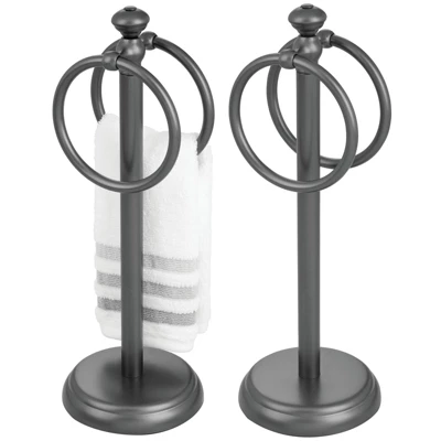 This Towel Holder by mDesign adds decorative style and useful functionality to the bath. Its free-standing design adds two sides of storage for fingertip towels without requiring any hardware or mounting to a wall or door. It features two rings that make hanging towels on them quick and easy while creating a beautiful presentation.