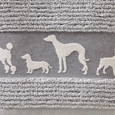 - Plush textured terry with a woven jacquard dog design along hem